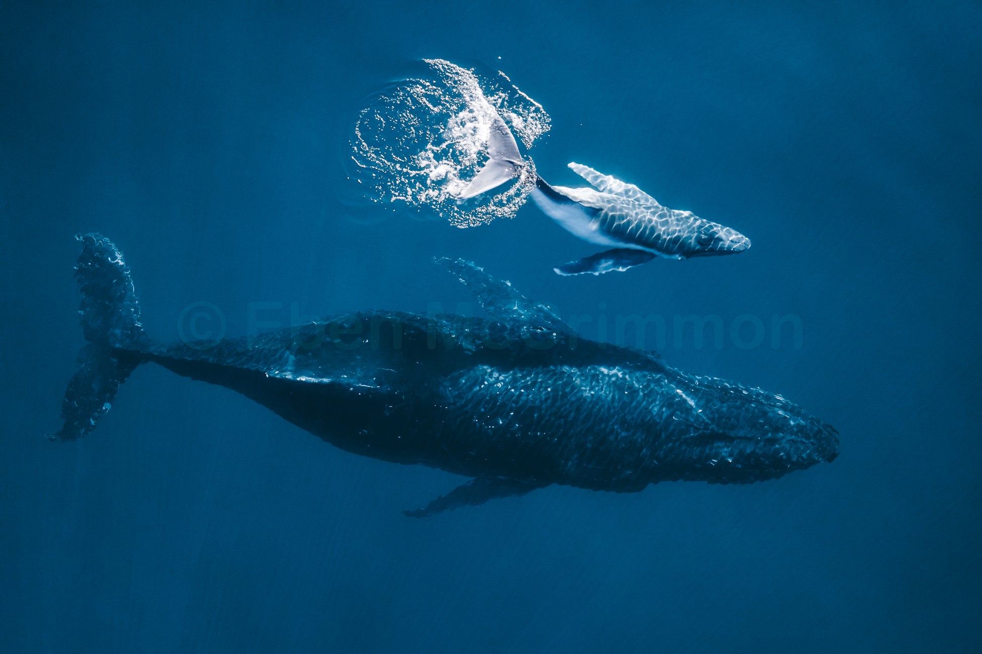 Humpback whale mother alongside as playful calf breaks the pristine glassy surface with its tail