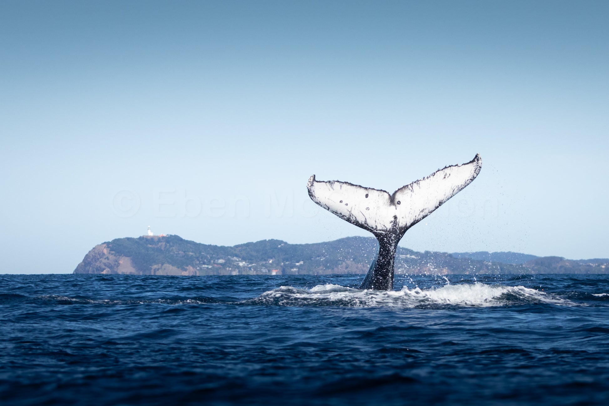 Humpback whale tail waving on serene sunny day with Cape Byron Lighthouse in the background.